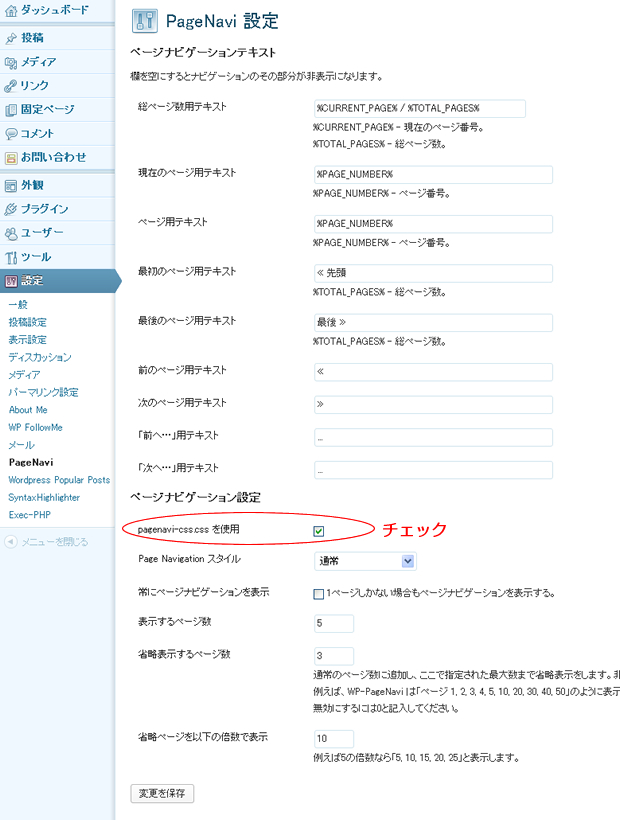 まずはWP-PageNaviの設定画面(左バーの「設定」>「PageNavi」ってとこね)で、「pagenavi-css.cssを使用」にチェックして下さい。