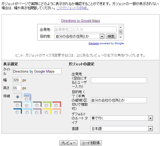 まずは、自分のサイトにガジェット追加「googlemaps道案内」にアクセスして、それぞれ項目を入れていきます。