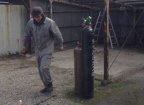 アセチレンガスのボンベに引火用のエアー(酸素)ボンベを二つのホースで引っ張り、ひとつにまとめて、そこから火が出て、その熱で鉄を溶断していくという