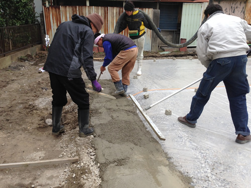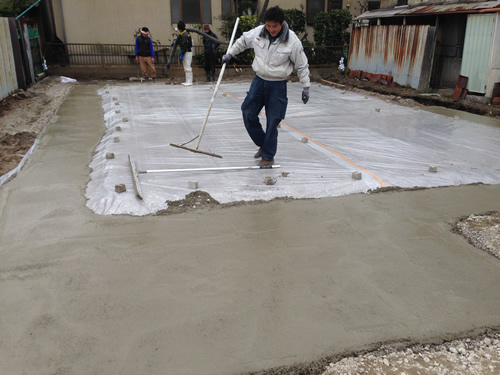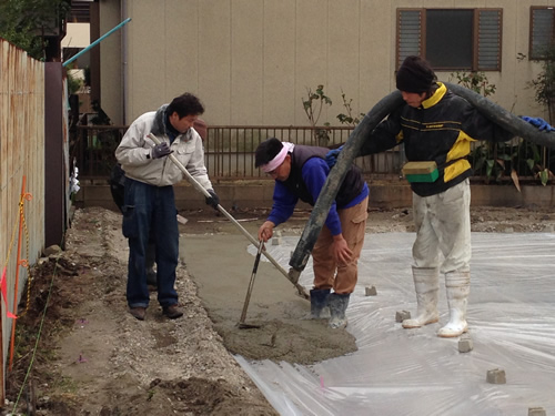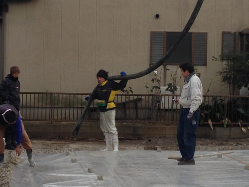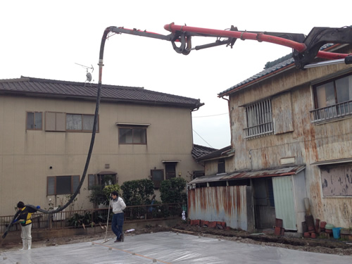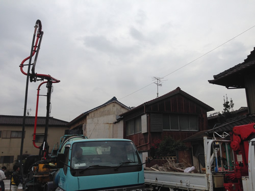 家を建てるところの外枠に生コン(コンクリート)を注入して基礎を固めます。