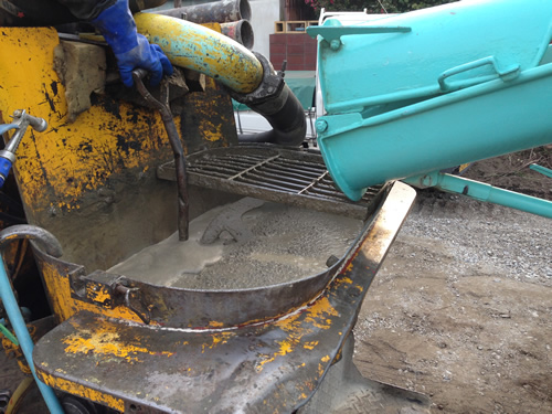 生コン車(手前青い車)が到着したら、生コンをぼとぼと投入してく車(奥の黒い、像の鼻見たいのがある車)に移していきます。