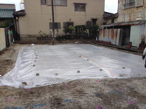 ほんで、盛土です。ちょっとだけ盛ってあるだけなので写真だと少しわかりにくいですが、ほんで最後に防水シートを被せて完成です。