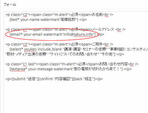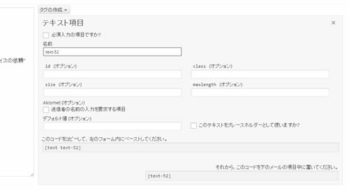 ようはcontactform7の設定画面で直感的に入力すると自動的に正しいhtmlの形でnameやvalue,placeholderなどの値を入れる用に吐き出してくれる、と言うことです。